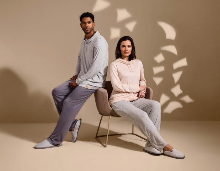 The women’s set is presented in soft blush pink and light grey, while the men’s design has a sophisticated two-tone grey palette. Matching slippers and eye masks also crafted from soft modal complete the ensemble. Slippers feature a plush inner sole for elevated comfort, while the eye mask is lined with an ultra-soft silk feel fabric to encourage uninterrupted rest.